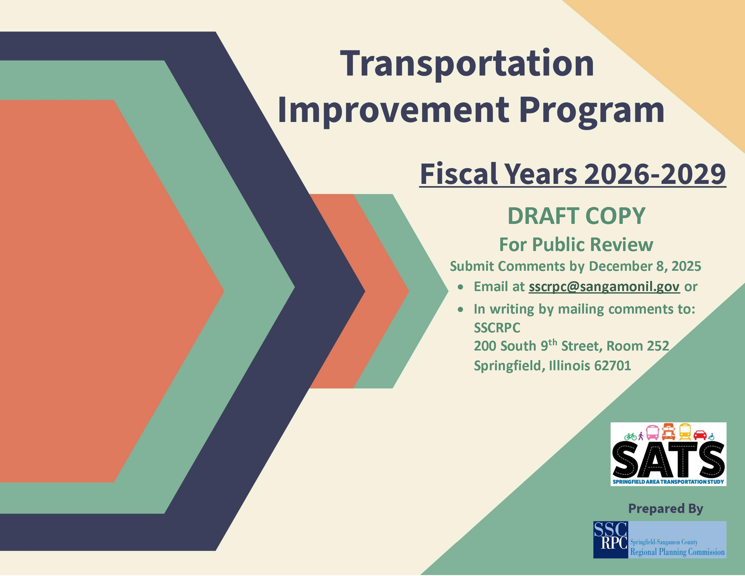 The Springfield Area Transportation Study (SATS) has prepared the Draft FY 2026-2029 Transportation Improvement Program (TIP), a four-year program of federally-funded and/or significant road, rail, bicycle, pedestrian, and mass transit projects. The TIP document is on file for public review until December 8, 2025, HERE or at the SSCRPC office.